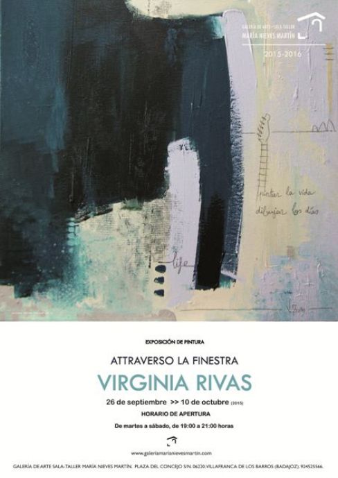 El sábado 26 de septiembre, a las 18:30 horas, inauguramos en la Galería de Arte María Nieves Martín “Attraverso la finestra”, exposición de la brillante artista extremeña Virginia Rivas. Se trata de la primera muestra individual de la Galería en esta nueva temporada que arrancamos y que nos conducirá al verano de 2016.