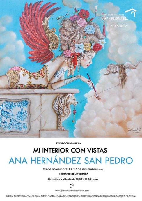 La exposición "Mi interior con vistas" de Ana Hernández San Pedro se se podrá visitar, en la Galería de Arte María Nieves Martín (Villafranca de los Barros, Extremadura), desde el 26 de noviembre hasta el 17 de diciembre de 2016. De martes a sábado entre las 18.30 y las 20.30 horas. Festivos, domingos y lunes, la Galería permanecerá cerrada al público. Como siempre, la entrada y visita de la exposición es gratuita.