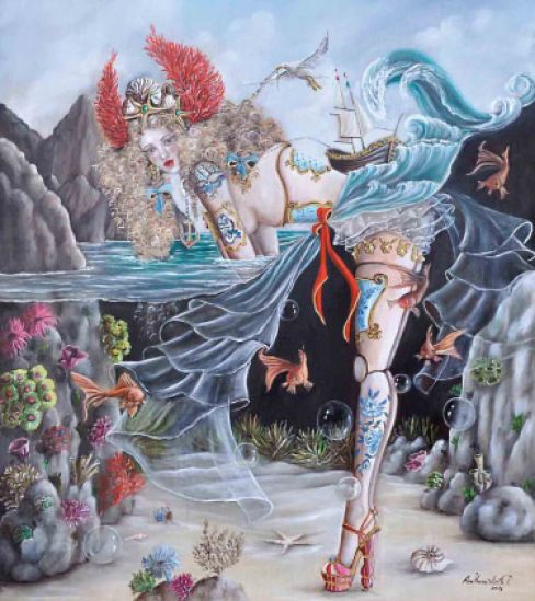 "Mi interior con vistas" es la última -y más reciente- producción artística de Ana Hernández San Pedro. En ella nos encontramos un mundo interior -abierto y sin tapujo- a través de una técnica depurada donde predominan los detalles, el dibujo, y sobre todo la complejidad y los símbolos que dan forma a su universo -único y personal- lleno de arquetipos como joyas, pares de zapatos desiguales, animales oníricos, paisajes surrealistas, lencería o tatuajes. En definitiva, Ana Hernández San Pedro nos muestra -y nos regala- su personalidad única, su impronta y madurez, su colección de bellas y delicadas muñecas –protagonistas indelebles de sus cuadros, antes controladas marionetas y ahora seres orgullosas e independientes- en esta magnífica exposición, en “Mi interior con vistas”.