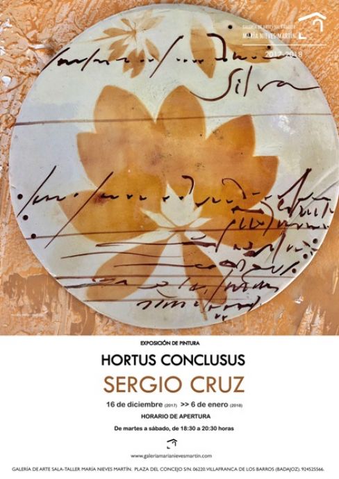 La exposición "Hortus Conclusus" de Sergio Cruz se podrá visitar, en la Galería de Arte María Nieves Martín (Villafranca de los Barros, Extremadura), desde el 16 de diciembre de 2017 hasta el 6 de enero de 2018. De martes a sábado entre las 18.30 y las 20.30 horas. Festivos, domingos y lunes, la Galería permanecerá cerrada al público. La entrada y visita a la exposición es gratuita.