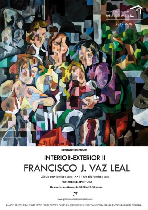 La exposición "Interior-Exterior II" de Francisco J. Vaz Leal se podrá visitar, en la Galería de Arte María Nieves Martín (Villafranca de los Barros, Extremadura), desde el 23 de noviembre hasta el 14 de diciembre. De martes a sábado entre las 18.30 y las 20.30 horas. Festivos, domingos y lunes, la Galería permanecerá cerrada al público. La entrada y visita a la exposición es gratuita.