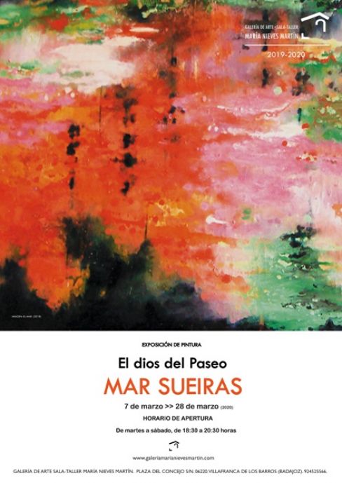 La exposición "El dios del Paseo" de Mar Sueiras se podrá visitar, en la Galería de Arte María Nieves Martín (Villafranca de los Barros, Extremadura), del 7 al 28 de marzo. De martes a sábado entre las 18.30 y las 20.30 horas. Festivos, domingos y lunes, la Galería permanecerá cerrada al público. La entrada y visita a la exposición es gratuita.