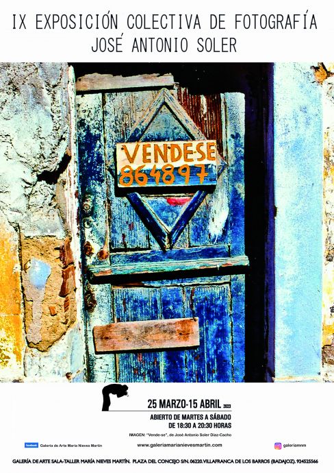 Por último, señalar que la IX Exposición Colectiva de Fotografía José Antonio Soler permanecerá abierta al público hasta el sábado 15 de abril. La entrada a la galería, como siempre, es gratuita, y el horario de visitas es de 18.30 a 20.30 horas, excepto domingos y lunes, días en que permanece cerrada al público.