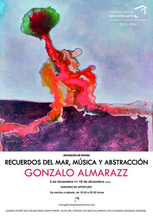 La exposición "Recuerdos del mar, música y abstracción", de Gonzalo Almarazz, se podrá visitar en la Galería María Nieves Martín (Villafranca de los Barros, Extremadura) del 2 al 16 de diciembre, de martes a sábado entre las 18.30 y las 20.30 horas. Festivos, domingos y lunes cerrado al público. Entrada y visita a la exposición gratuita.